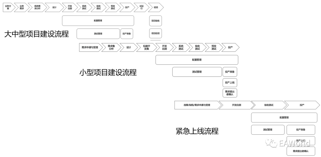 大中型项目全生命周期建设和投产流程,通常用于大型项目群的管理过程,以及新增系统的建设管理过程。