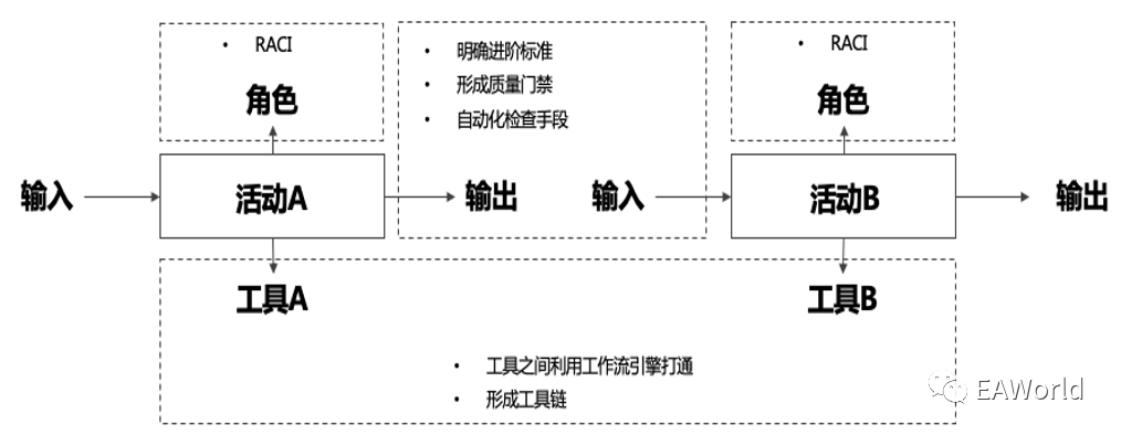 我们在分析完每个二、三级子流程(活动)之后,可明确各串联流程活动之间的交付物(此输出为彼输入),以及交付物的质量标准(必选项是哪些,必选项要完成到什么程度才能流入到下一流程活动环节),每个活动的分工梳理清晰之后,才能打通各活动对应的工具形成自动化的工具链,使工件自动化流转。