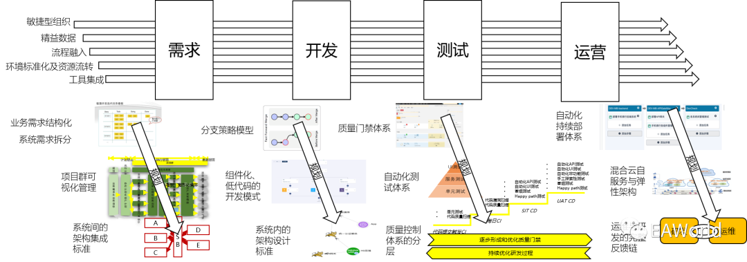 纵向需求、开发、测试、运营的敏捷化转型,规则、标准、规范的设定,系统间复杂集成架构的构建与支撑