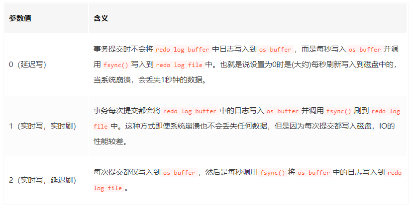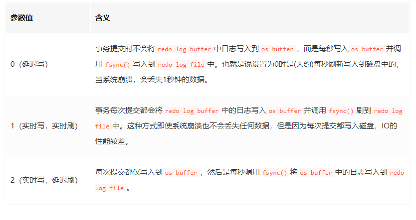 mysql支持三种将redo log buffer写入redo log file的时机,可以通过innodb_flush_log_at_trx_commit参数配置,各参数值含义如下: