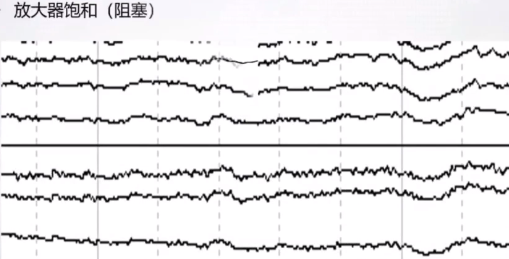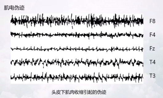 有很多尖头的脉冲,聚集在一块。头皮下肌肉收缩引起的伪迹。一般在头部戴的脑电帽,勒的紧的部位易产生肌电伪迹。