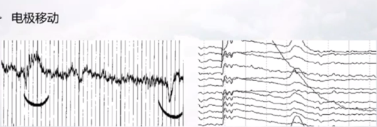下图左图中是单个电极移动产生的结果,右图中可以看见所有波形都发生了移动,这是所有电极发生移动所导致的。产生这个的原因,有可能是受试者头部有晃动,头部发生了相对位移。