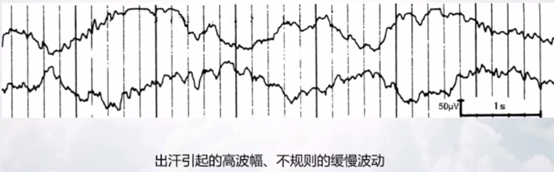出汗引起的伪迹如下图,高波幅、不规则的缓慢波动。