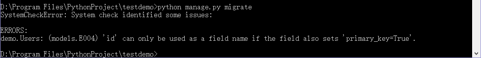 原因是表中定义了 id 字段,同时这个字段被设定为主键。具体的解决方式是:修改 model.py 中 id 字段的定义; 将其中的 null=True 修改为 primary_key=True。