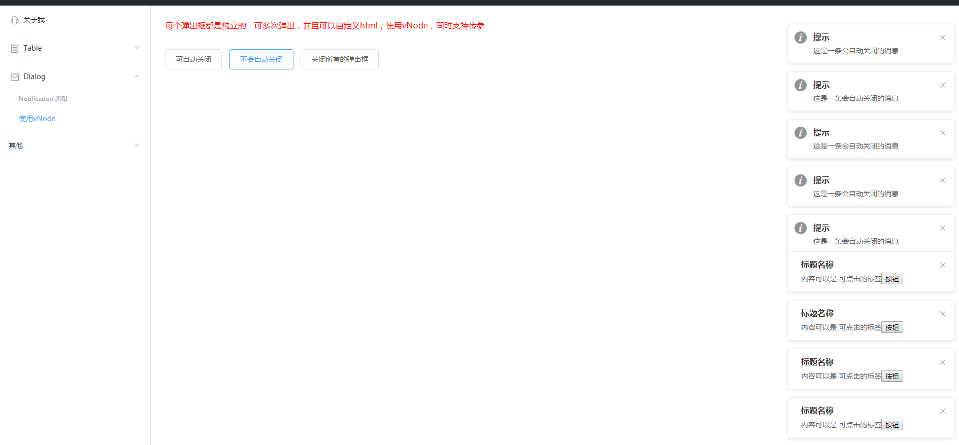 1、每个弹出框都是独立的,可多次弹出,并且可以自定义html,使用vNode,同时支持传参