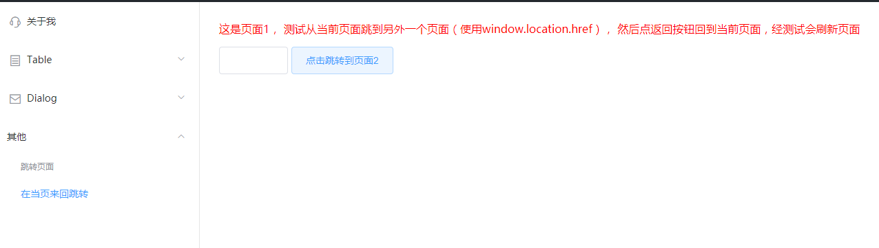 1、这是页面1, 测试从当前页面跳到另外一个页面(使用window.location.href), 然后点返回按钮回到当前页面,经测试会刷新页面