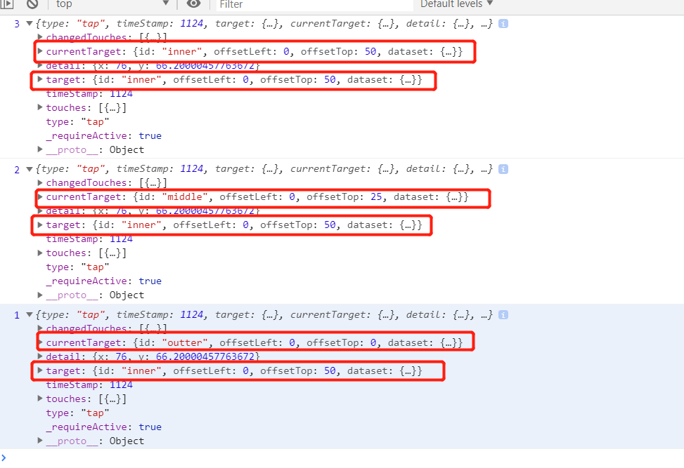 点击子元素inner,但由于事件冒泡父元素middle和outter都触发,从上图中我们可以看出区别: