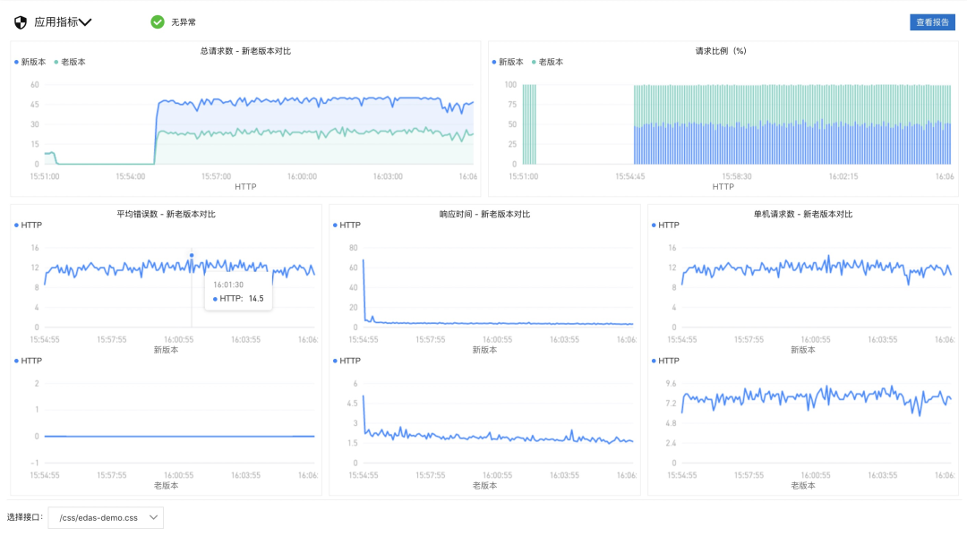 目前EDAS以接口的维度提供了每个接口在发布前后的总的请求数对比以及请求该比例的图例,并且还能够详细的看到在发布前后该接口的错误数、响应时间以及单机的请求数对比,如下图所示: