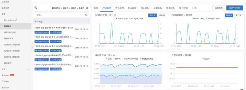 上图功能提供了以应用实例的维度来查看每个实例的监控信息,提供的JVM/CPU/Load/内存等的监控信息也是我们经常需要关注的,当发现内存占用高,并且有频繁的FullGCC的情况时,我们可以通过创建内存快照进行分析来快速定位问题。SQL分析的能力也能快速帮助我们定位到慢查询用来排查问题。