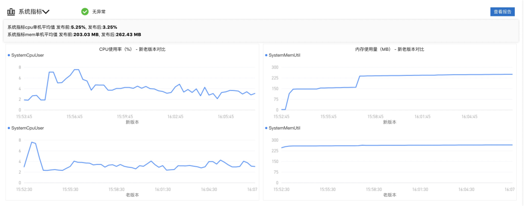 在新的业务功能上线的时候,我们除了对业务本身的一些异常和指标进行关注外,还需要关注系统的指标,这关系到我们需要评估现有的机器是否能够支撑我们的所有流量,是否需要进行水平扩容来更好的支持业务,我们的发布监控系统同样集成了系统的监控的能力,为我们的发布过程来保驾护航,详细的监控如下图所示: