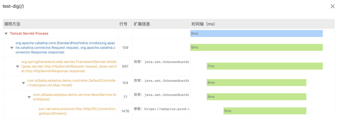 调用链路的追踪在分布式系统下是一个必不可少的工具,尤其是在排查上下游依赖中究竟是哪个系统拖慢了整个请求非常有用,在调用的方法栈中可以直观的追踪到调用出错的地方。