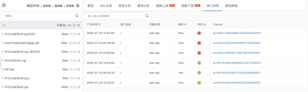 这里提供了以接口维度的监控信息,可以详细的看到接口在最近一段时间的请求信息,这里重点介绍一下接口快照功能,通过接口快照我们可以看到该接口的请求耗时,以及请求的TraceId,根据这个TraceId我们可以详细的看到本次请求的调用链以及调用的方法栈。