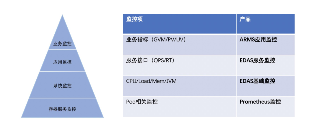 在应用发布上线的时候我们最担心的莫过于因为代码的bug引发业务的问题,虽然我们可以通过灰度的方式分批发布减小影响范围,但是如果能够在发布的过程中从实时监控中快速的发现问题进行回滚,那么就能缩短业务受影响的时间。因此我们可以看到灰度、监控、回滚是整个发布过程中不可或缺的三大利器,有了这三大利器后,我们能够做到随时发布,从而加快业务的迭代和上线速度。而监控作为基础设施的一个重要环节,是保障生产环境服务稳定不可或缺的一部分,目前EDAS提供了非常丰富的监控能力,下面我们从不同的场景来详细介绍一下这些监控能力。