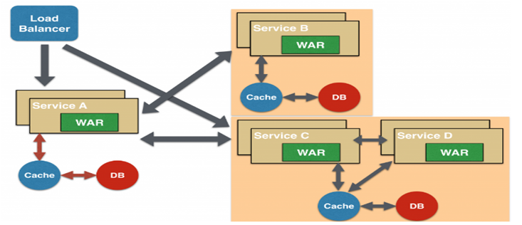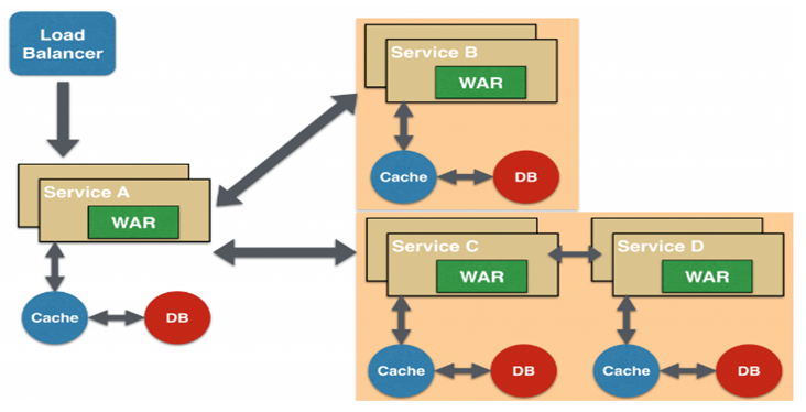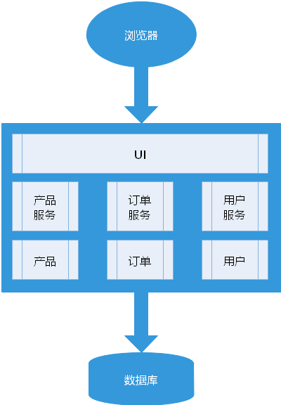 既所有的功能打包在一个 WAR 包里,基本没有外部依赖(除了容器),部署在一个 JavaEE 容器(Tomcat,JBoss,WebLogic)里,包含了 DO/DAO,Service,UI 等所有逻辑。