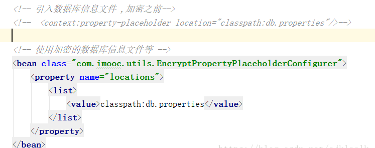 1.首先我们需要自定义一个类,继承 PropertyPlaceholderConfigurer。编写代码,达到启动服务器时判断哪些字段需要解密,并将解密后的值返回出去