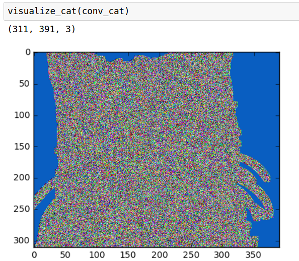 As you can see the cat is really noisy because all of our weights are randomly initialized and we haven’t trained the network. Oh and they’re all on top of each other so even if there was detail on each layer we wouldn’t be able to see it. But we can make out areas of the cat that were the same color like the eyes and the background. What happens if we increase the kernel size to 10x10?