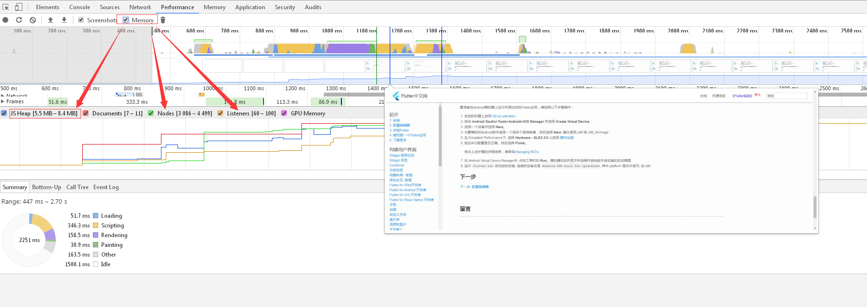 点击录制后,进行你认为卡的操作,然后stop,可以看页面渲染快照并且当时的js heap,监听器行为,一般是同步,如果heap到顶部没下落,说明没有正常GC,一般分析为bus消息总线监听后没有在destroyed中销毁。