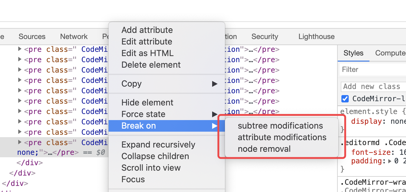 dom元素变化时可以加入断点,包括子节点修改、属性修改和节点移除