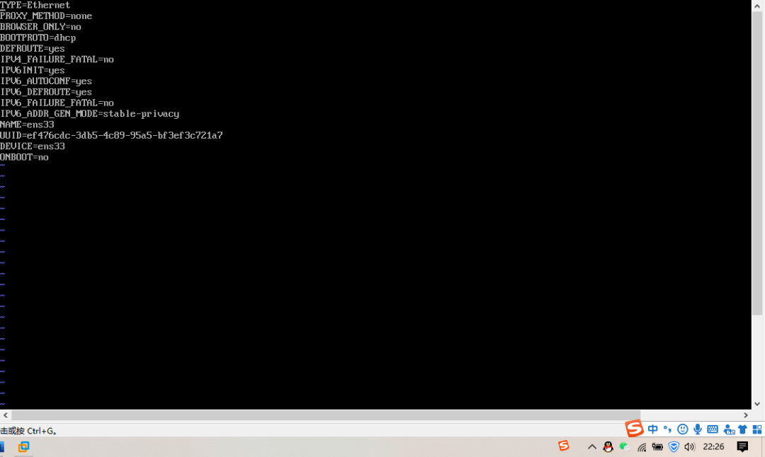 按下键盘上的 i 键,进入编辑模式,将ONBOOT=no 改为 yes 即可,然后依次按 esc,shift + zz 保存退出