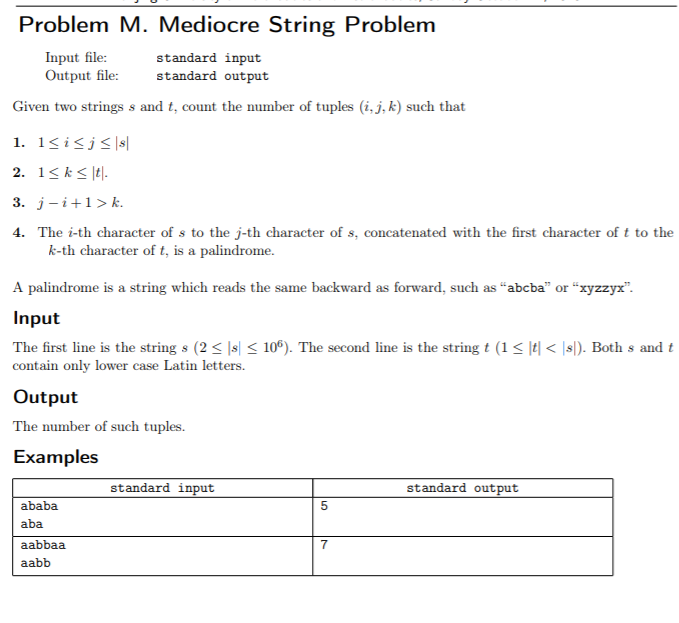 一个串$S$,一个串$T$,在$S$中选一段子串$S[i,j]$,在$T$中选一段前缀$T[1,k]$使得$S[i,j]T[1,k]$拼起来得到的字符串是回文,并且$S$的这个串长度大于$T$的这个。问有多少这样的三元组$(i,j,k)$