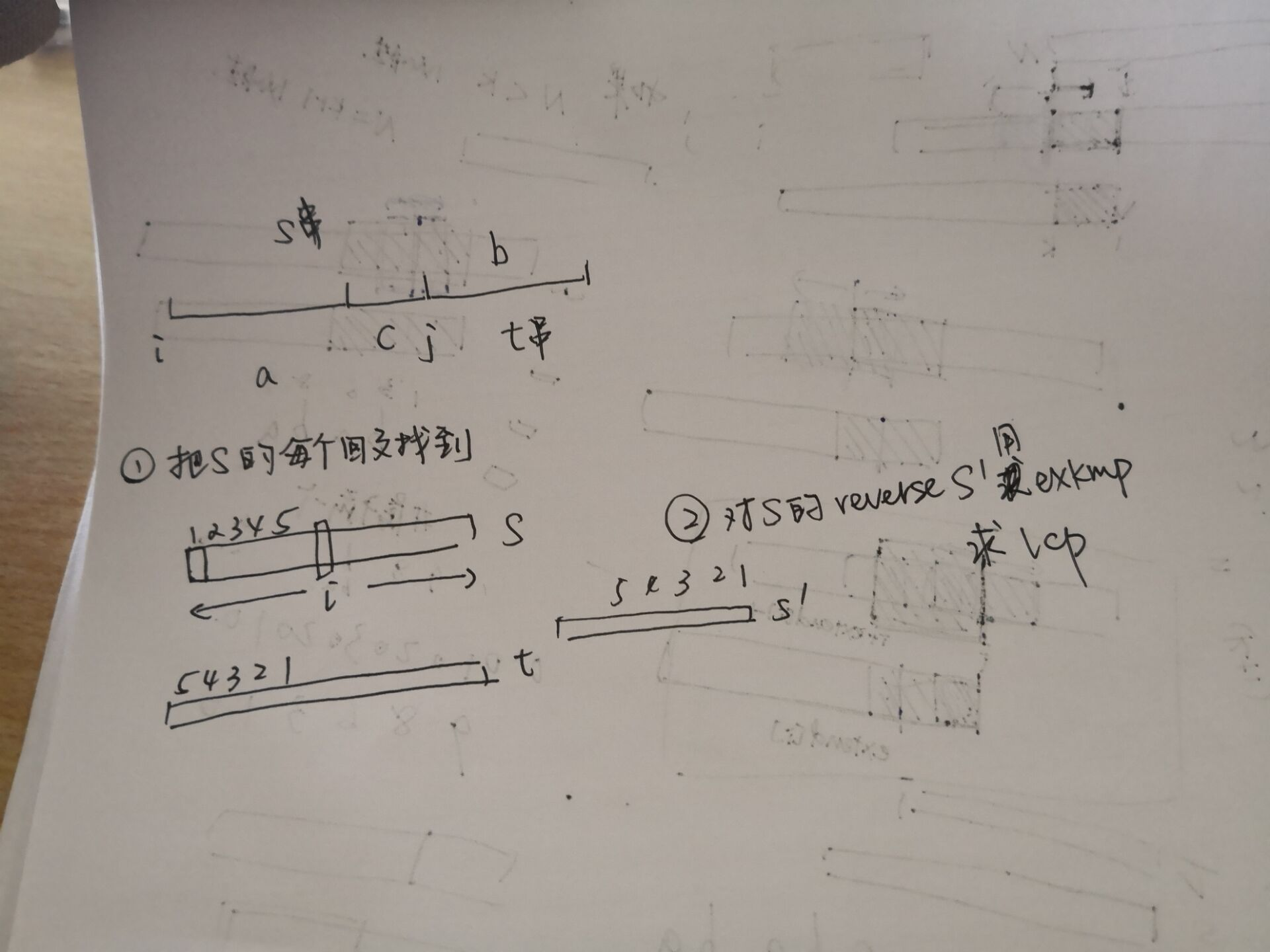 首先我们可以知道我们要找的其实就是这样三个串,$a,b,c$。其中$a$和$c$合起来是$S$中连续的一段子串,$b$在$T$中且$a$和$b$是对称的,$c$一定要是一个回文,且长度至少是$1$。