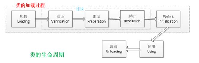 类的生命周期包括这几个部分,加载、连接、初始化、使用和卸载,其中前三部是类的加载的过程,如下图: