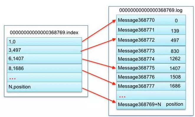 以起始偏移量命名并排序这些文件,只要根据offset **二分查找**文件列表,就可以快速定位到具体文件。当offset=368776时定位到00000000000000368769.index和对应log文件。