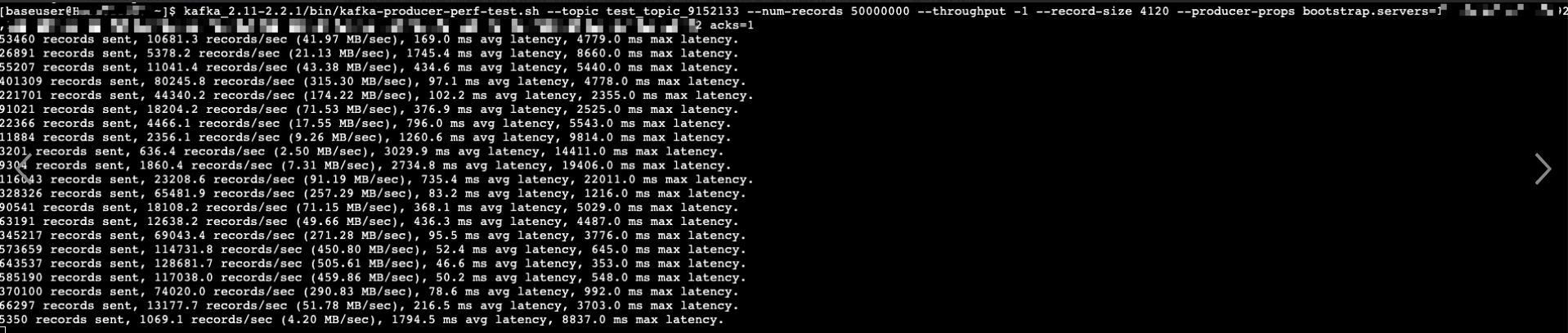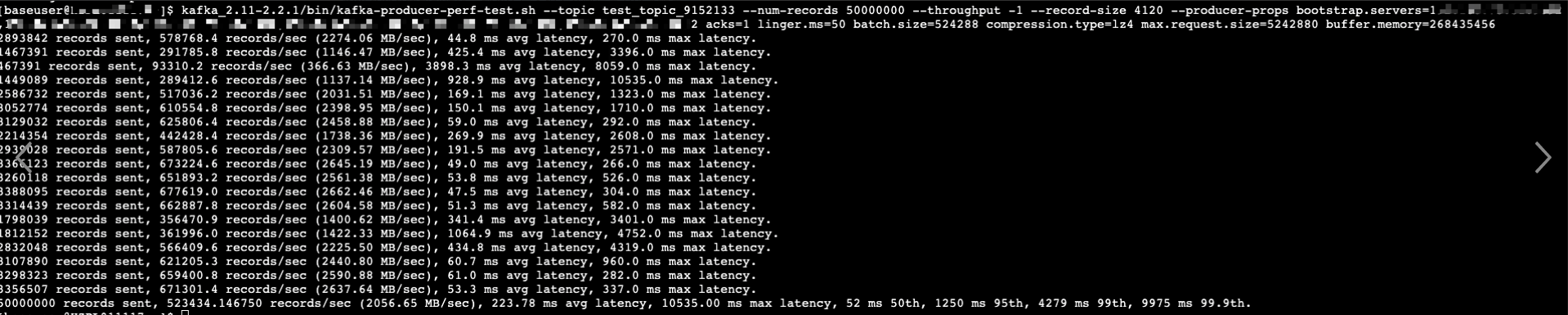 在生产环境的一台服务器上,使用以上参数对集群进行生产发送性能压测: