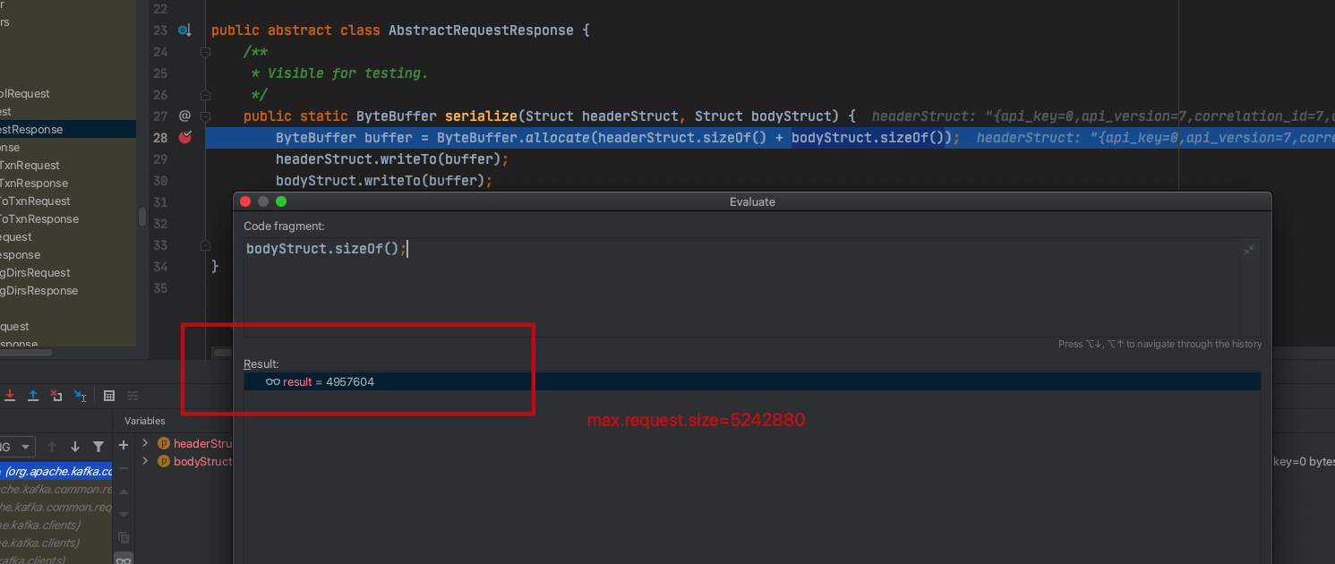 如上图,当 max.request.size=5242880 时,请求 broker 发送的数据量不大于 max.request.size。