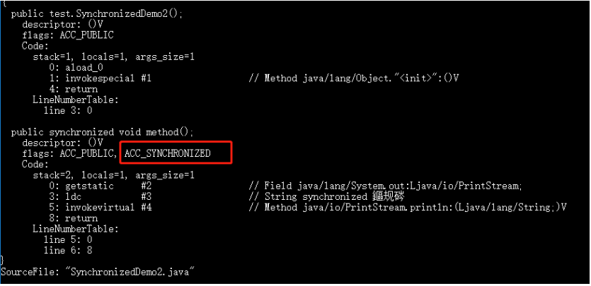 synchronized修饰方法时并没有monitorenter指令和monitorexit指令,取而代之的是ACC_SYNCHRONIZED标识,该标识指明了该方法是一个同步方法 JVM通过ACC_SYNCHRONIZED访问标志来辨别一个方法是否为同步方法,从而执行相应的同步调用