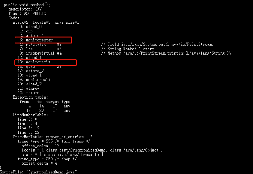 通过JDK自带的javap命令查看SynchronizedDemo类查看相关字节码的信息,首先切换到类的对应目录执行 javac synchronizedDemo.java 命令生成编译后的.class文件 然后执行javap -c -s -v -l synchronizedDemo.class