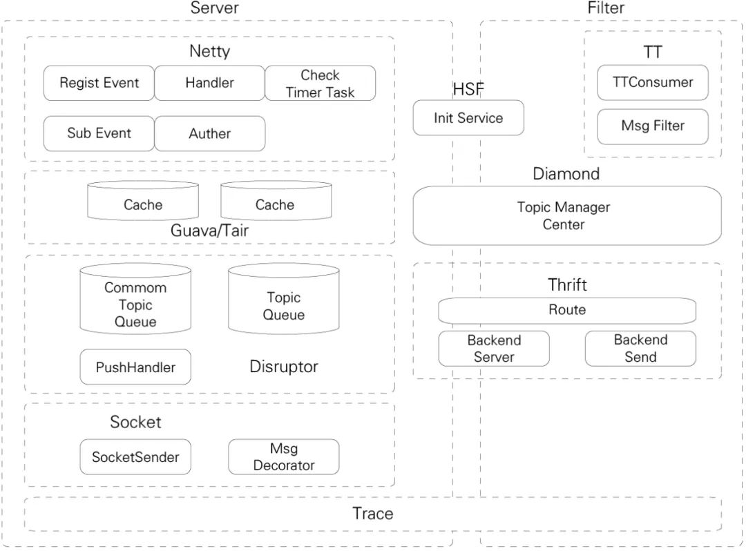 iPush应用产品是一个面向TT、MetaQ等不同消息源,通过定制过滤规则,向Web、无线等终端推送消息的中间件平台。iPush核心服务器端基于高性能异步事件驱动模型的网络通信框架Netty 4实现,结合使用Guava缓存实现本地注册信息的存储,Filter与Server之间的通信采用Thrift异步调用高效服务实现,消息基于Disruptor高性能的异步处理框架(可以认为是最快的消息框架)的消息队列,在服务器运行中Zookeeper实时监控服务器状态,以及通过Diamond作为统一的控制触发中心。