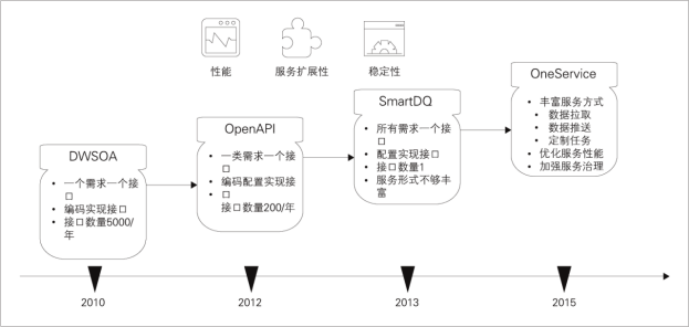 阿里数据服务架构演进过程如图6.1所示。基于性能、扩展性和稳定性等方面的要求,我们不断升级数据服务的架构,依次经历了内部代号为DWSOA、OpenAPI、SmartDQ和OneService的四个阶段。