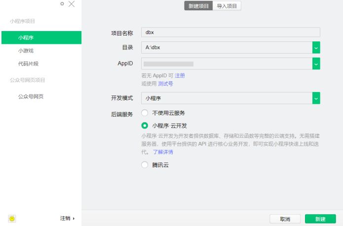 使用自己的AppID新建小程序项目,后端服务选择小程序·云开发,点击新建,完成项目新建。