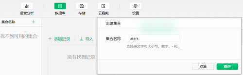 在云开发控制台中创建数据库集合,我们新建一个users集合,我们只需新建集合,通过js中使用云开发API可自动创建集合中的属性和数据。