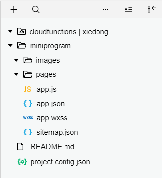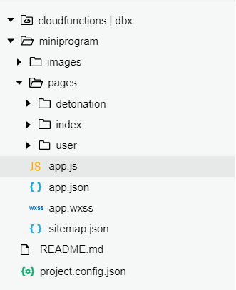 新建后,微信端为我们提供了一个参考的模板程序,这里我们自己来创建各个所需的文件与代码,所以删除所有不需要的文件,删除cloudfunctions、miniprogram/images、miniprogram/pages文件下所有文件,同时也删除style文件和删除app.json中原始的页面配置。