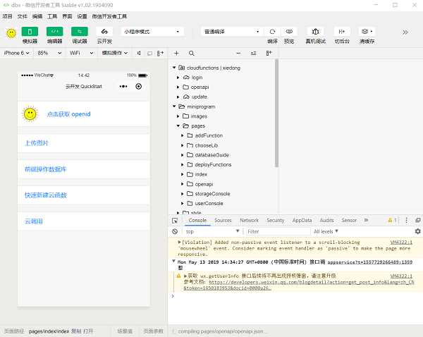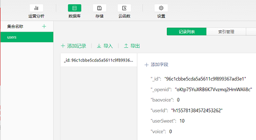 我们点击“点击登录”按钮,然后对程序进行授权,授权后可以看到我们的头像和用户名都显示出来了,同时,打开云开发控制台,查看users集合,可以看到我们信息已经成功保存在了集合中。