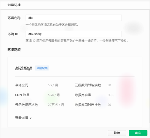 设置环境名称,环境名称可以根据自己需求设置,这里设置与项目名相同dbx,下方的环境ID会自动生成,无需修改,点击确定完成创建。