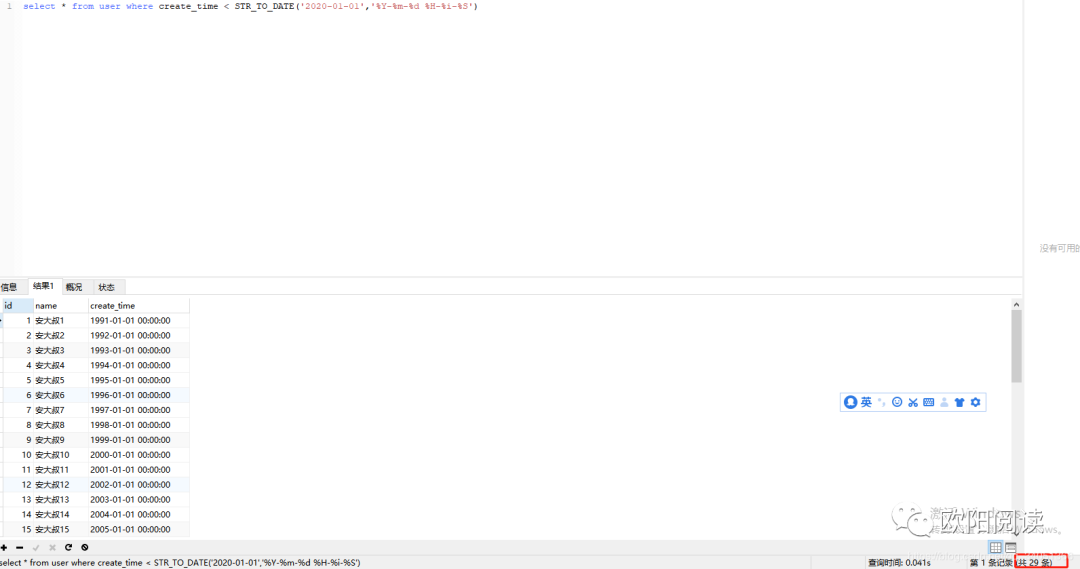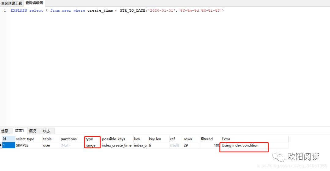 3.用create_time<2020-01-01 作为条件进行查询,查询出29条数据,并explain 解释一下,发现用了索引。