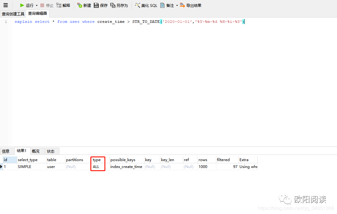 4.再将create_time>2020-01-01 作为条件进行查询,查询970条数据,并用explain 解释一下,发现并不会用到索引,索引失效了。