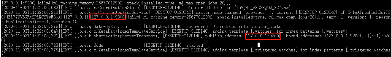- 启动:双击bin/目录下的elasticsearch.bat 文件;启动后可以看到默认的公开端口9200,通信的端口9300