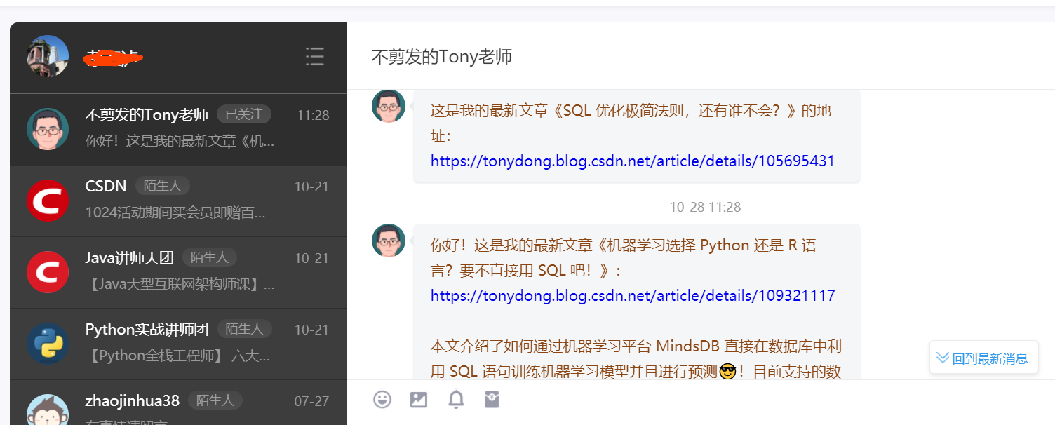 最近遇到比较烦恼的事情,自动关注了Tony老师后,不停的收到他的私发消息,点开一看,全是广告,刚开始还点开看看,发现是收费文章系列和视频系列,后来多了就比较烦恼,我不是他的意向客户呀。