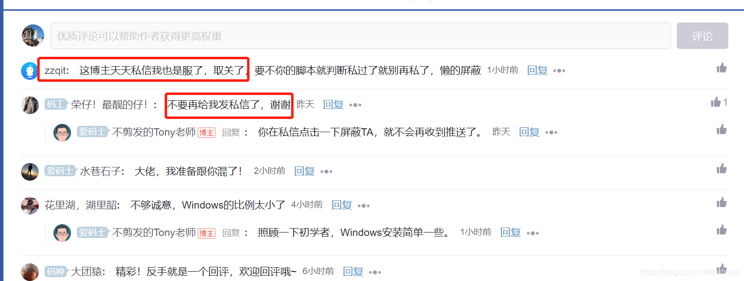 我知道tony老师不是那种不停发消息打扰别人的人,所以就在他博文下面留言咨询了,Tony老师回复说,发送会自动把所有关注他的人都发,他没法设置哪些人不发,建议我选择忽视他的消息。我仔细看了tony老师的博文留言评论,发现我并不是唯一的烦恼人,还有其他的人也有此烦恼: