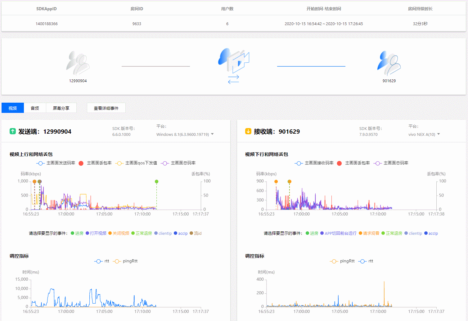 仪表盘则是可以排查每一次具体的通话的各维度质量情况,比如某个时刻的一次卡顿的产生原因,或者用户某个时间段内的网络质量等等。特别一提的是,我们的仪表盘系统是开放给每一个客户去使用的,从而让客户可以实时监督我们的技术指标和服务质量。