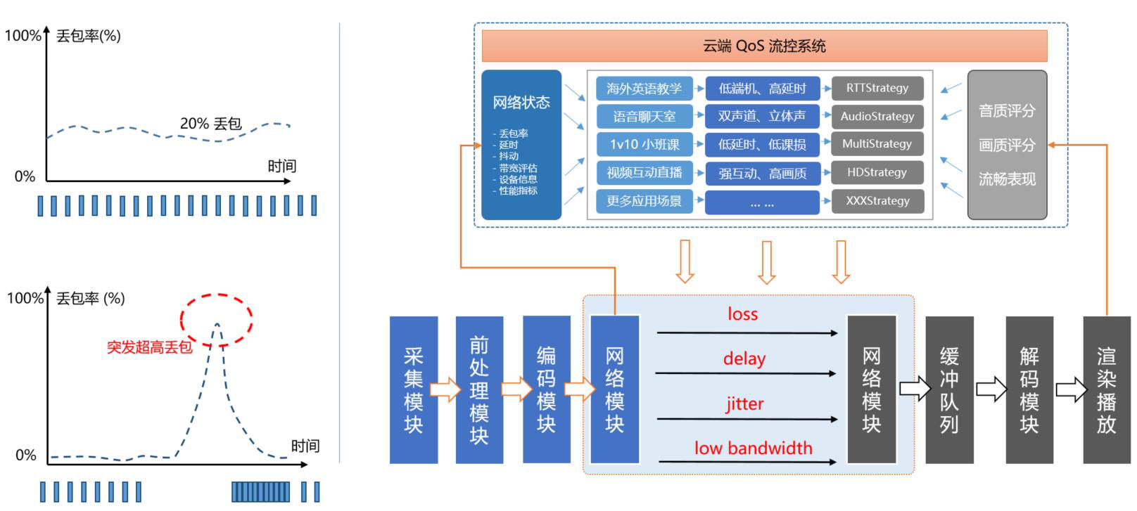所以,我们创新性地引入了一套面向企业服务的 QoS 流控系统,这套系统内部设置了很多调节算法和调控策略,它不仅会有对单独网络模块的调节,也会在发送端和接收端将画质、音质、流畅度等一系列影响用户体验的音视频数据指标以很高的实时性收集上来,从而让整个流控模块可以为最终的用户体验和主观的音视频效果去做实时地调节。