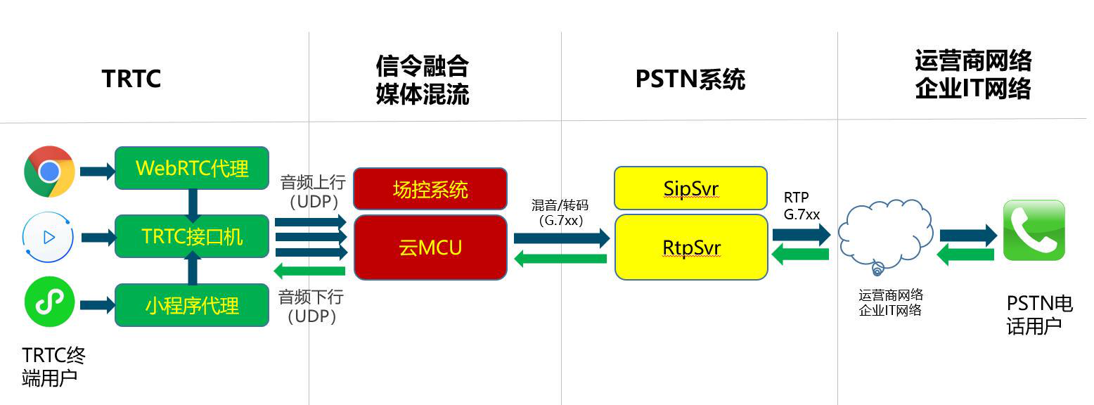 如果您问:如果浏览器不行,微信版本也太旧,是不是就没有办法了?我要说这样也是可以的,通过跟 sip 协议的打通,TRTC 还将自己的音频通信能力扩展到了蜂窝电话上,比如现在腾讯会议中的电话入会,就是采用了这种能力实现了网络线路和传统电话线路的互通。
