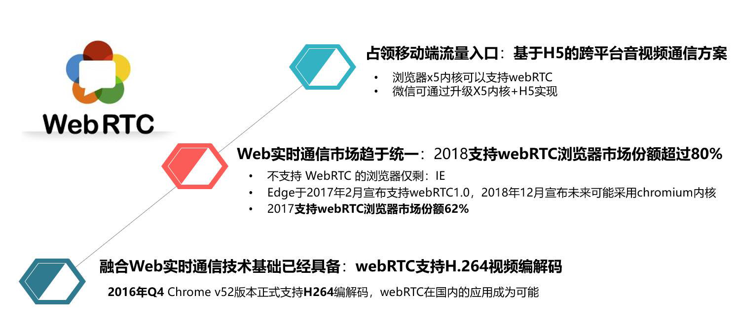 首先要扩展的就是对 WebRTC 的支持。WebRTC 在 2016 年底开始支持 264 编码方案。在 2017 年,支持 WebRTC 系统的浏览器已经占据了 60% 以上的市场份额。所以我们很快意识到,让 TRTC 跟 WebRTC 互通是大势所趋。