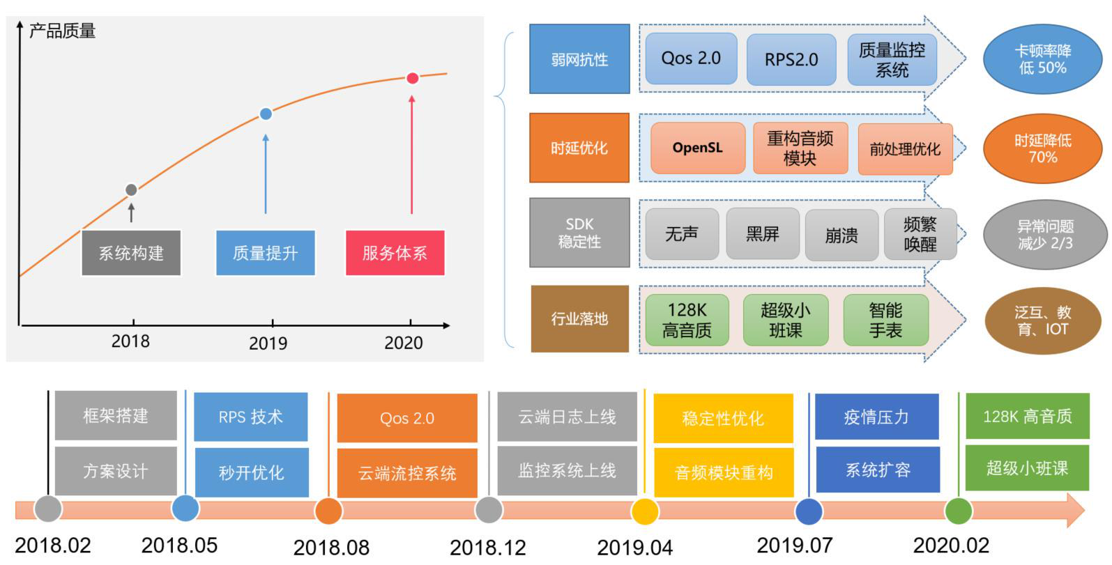 作为一款打造了多年的 RTC 服务,以上介绍的这些都还只是整个体系中的部分技术点,过去几年的时间里,从系统搭建到质量提升,再到今天的服务体系。团队一直都非常专注地在这个方向持续深耕,几乎每个季度我们都会取得一些质量和能力上的突破,就这样一步一个脚印,逐步将整个系统的能力锻造成业内领先的水平。