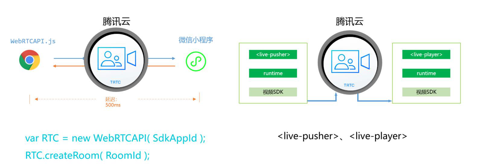 为此,我们团队跟微信小程序团队进行了深入的合作,微信小程序团队的同事们非常开放地新增了两个音视频标签 live-pusher 和 live-player,虽然有标准协议的种种限制,但我们依靠云端强大的节点分布和协议互转能力,在微信小程序上实现了非常不错的音视频体验。