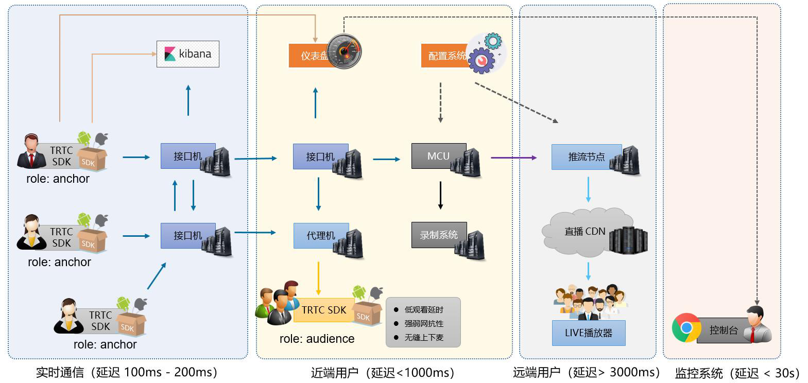不仅如此,TRTC 系统还支持跟直播 CDN 系统的无缝融合,以及企业商用服务所必需的录制和监控能力,进而将众多云计算能力集成到这套高并发低延时的 RTC 系统中,从而能够应对各行各业的客户诉求。